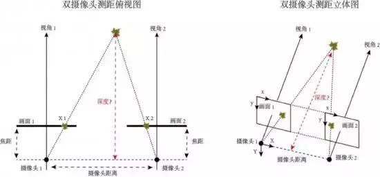 雙攝像頭測距是根據(jù)幾何原理來計(jì)算深度信息的。使用兩臺攝像機(jī)對當(dāng)前環(huán)境進(jìn)行拍攝,得到兩幅針對同一環(huán)境的不同視角照片,實(shí)際上就是模擬了人眼工作的原理。因?yàn)閮膳_攝像機(jī)的各項(xiàng)參數(shù)以及它們之間相對位置的關(guān)系是已知的,只要找出相同物體(楓葉)在不同畫面中的位置,我們就能通過算法計(jì)算出這個(gè)物體(楓葉)距離攝像頭的深度了。
