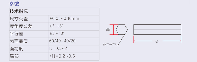 勻質(zhì)六角導(dǎo)光棒采用內(nèi)部全反射原理,將非均勻光源換成均勻光源,無(wú)論其光譜特性如何。與方形結(jié)構(gòu)的導(dǎo)光管相比,六角結(jié)構(gòu)導(dǎo)光管可使光損失降低35%。數(shù)值孔徑 (NA) 值小的光源需要較長(zhǎng)的光管來(lái)使光線均勻化,而數(shù)值孔徑值大的光源,則使用較短的光管即可以滿足要求。采用精密的N-BK7制作而成,廣泛適用于可見光波段。